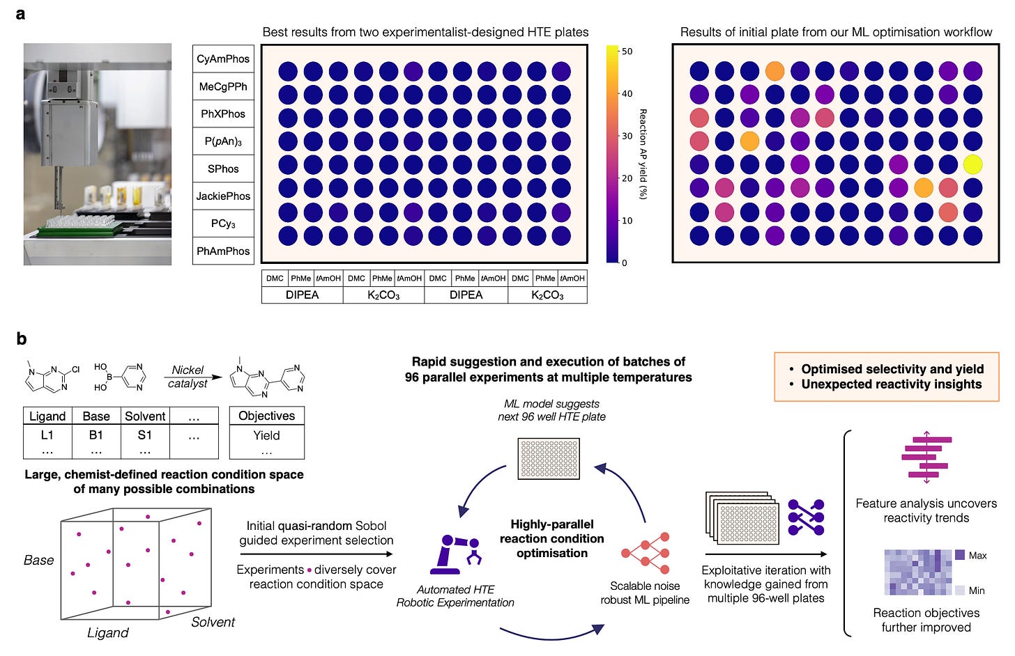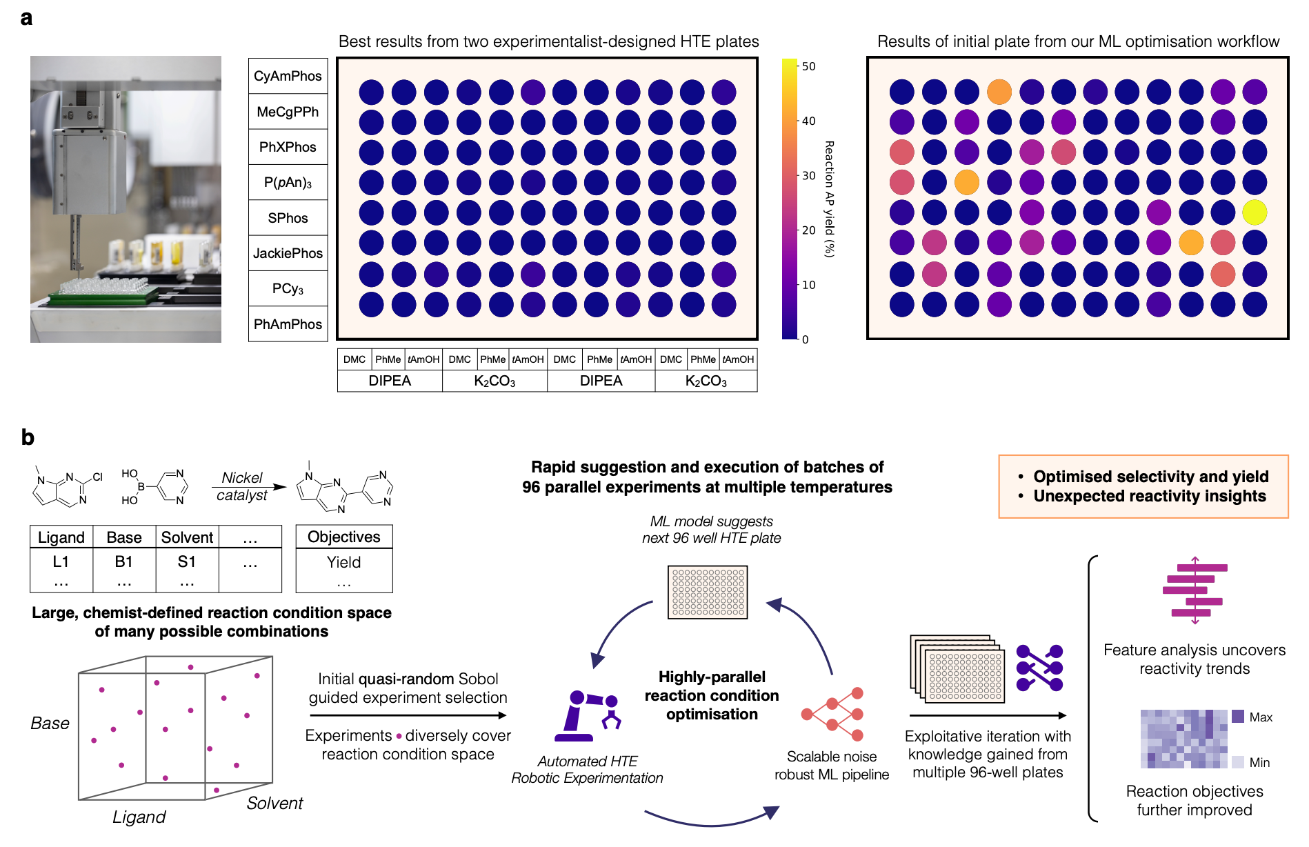 To address these challenges, data-driven approaches leveraging machine learning (ML) have emerged as promising alternatives. Among these, Bayesian optimisation—a technique that iteratively selects experiments based on predictive uncertainty and expected improvement—has shown considerable promise in chemistry. Despite their potential, existing ML-driven methods for chemical optimisation typically focus on small-scale batch experiments and face limitations when scaling up to the highly parallel batches typical in modern automated HTE setups. There is thus a critical need for scalable machine learning frameworks capable of efficiently handling high-dimensional reaction spaces and large parallel experimental batches, while maintaining robust performance and interpretability.
